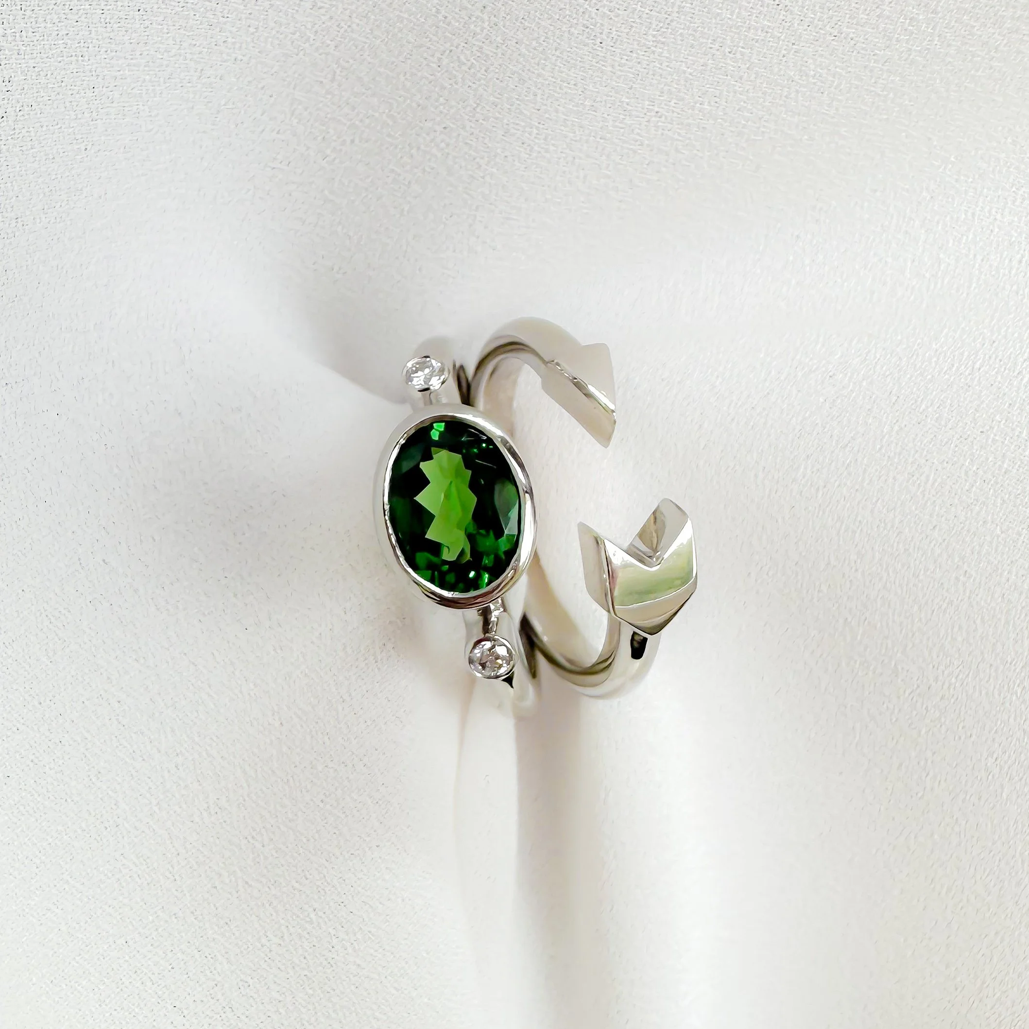 Platinum Cupid's Arrow ring and Venus ring set with Tsavorite garnet and diamonds