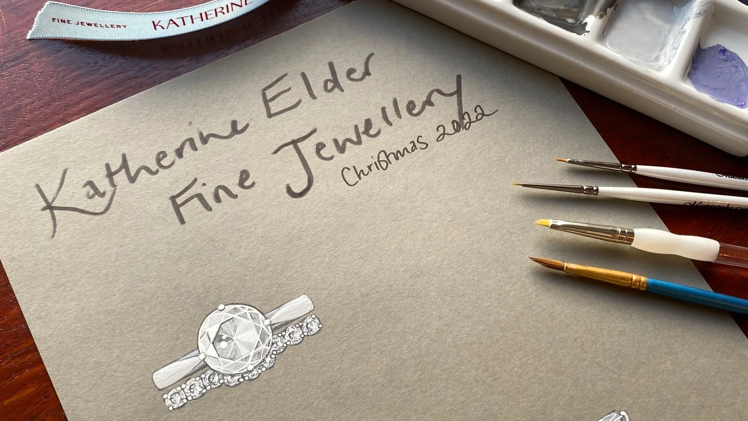 Hand-painted bespoke jewellery design by Katherine Elder showing custom engagement ring sketch