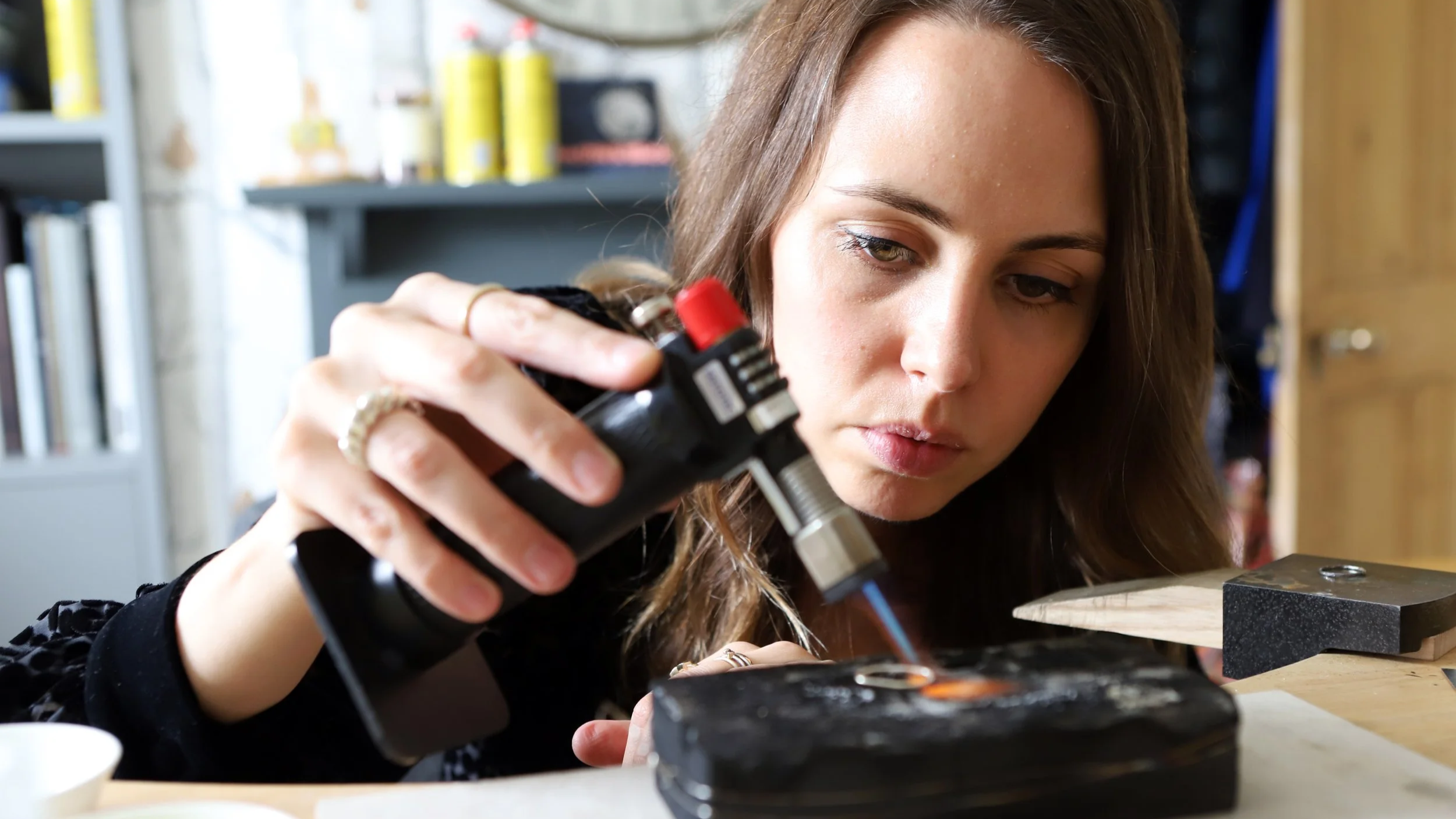 Katherine Elder at her bench using traditional goldsmithing tools and techniques to handcraft fine jewellery
